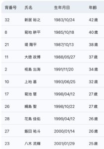 • ベテランの安定感: 30代後半〜40代のレジェンド級選手(新居選手、菊地選手、堤選手、大徳選手)が精神的支柱として在籍しています。