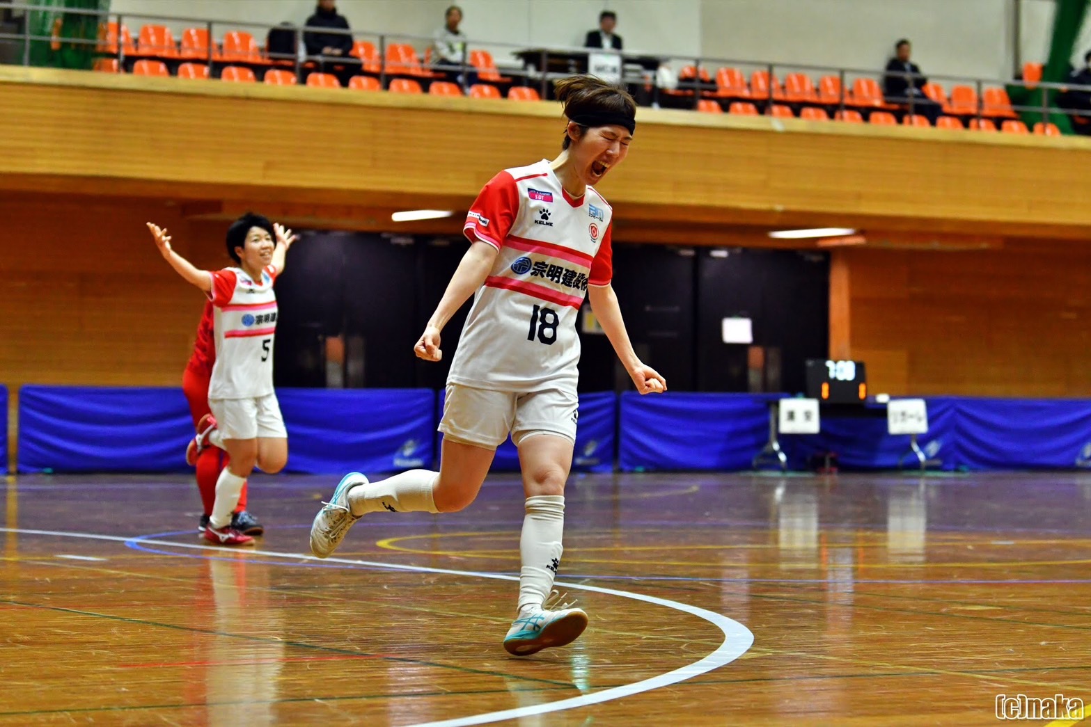 12分、#18嶋田が自陣から相手DFの股を抜き右サイドをドリブルで駆け上がります。前を走っていた#5植村と2対1の局面を作りますが、相手DFの裏をかき、パスではなく自分でシュートを選択。強烈な右足トーキックシュートが相手ゴールに突き刺さり、2-1の勝ち越しゴールが生まれます。前節退場処分によりピッチに立つことが出来なかった#18嶋田が、その悔しさを晴らすような魂の2得点目に会場の盛り上がりは最高潮に達します。